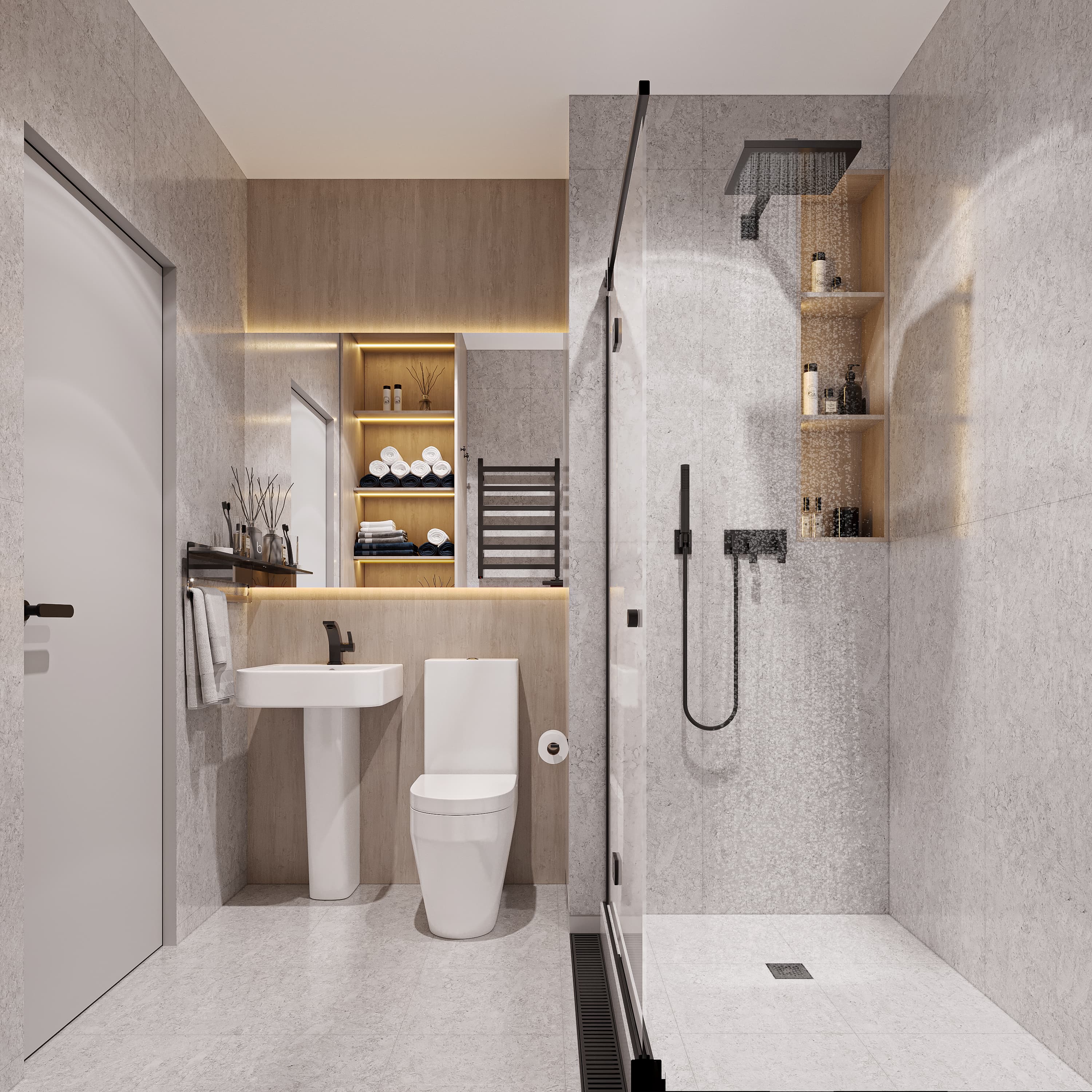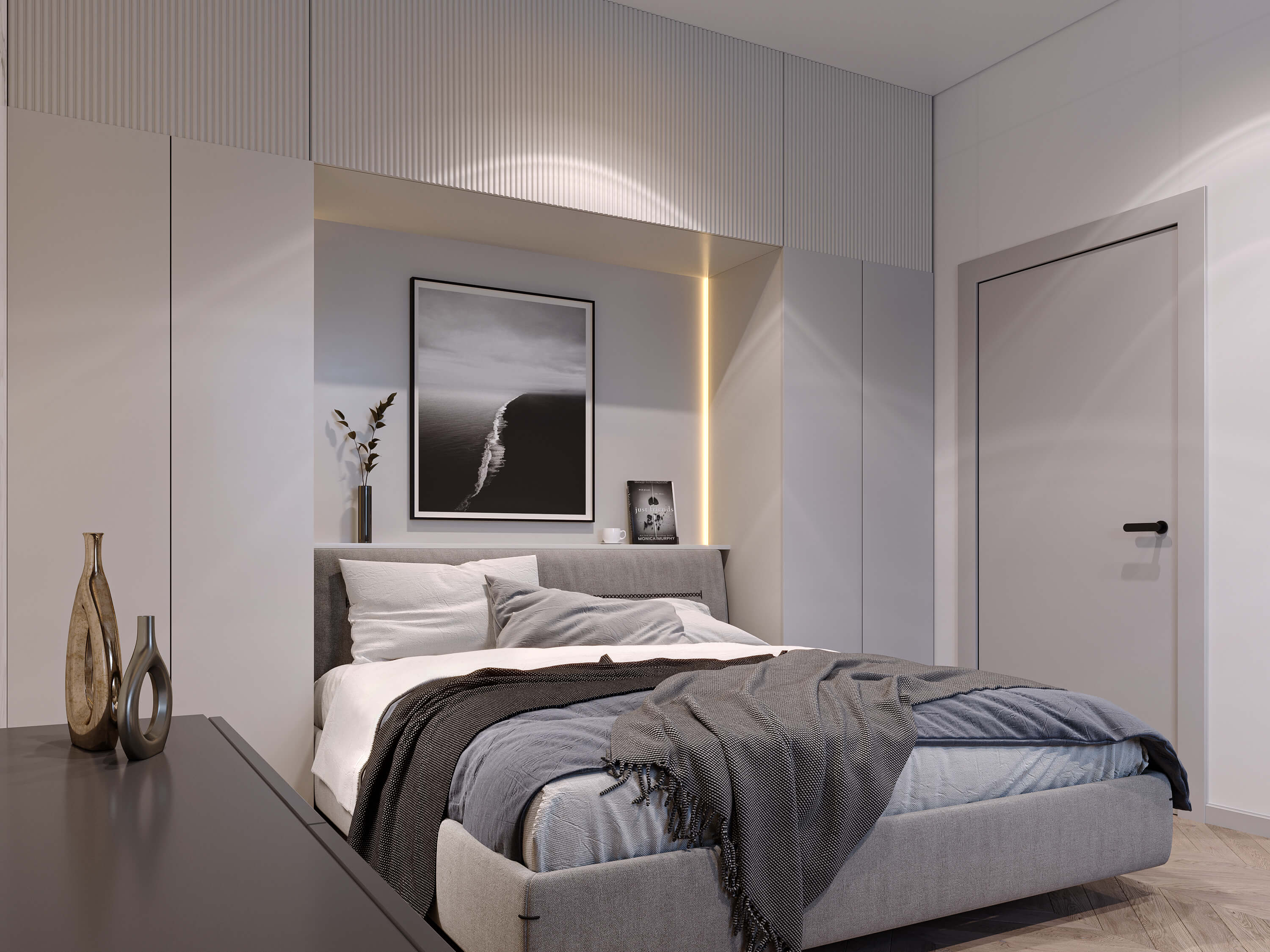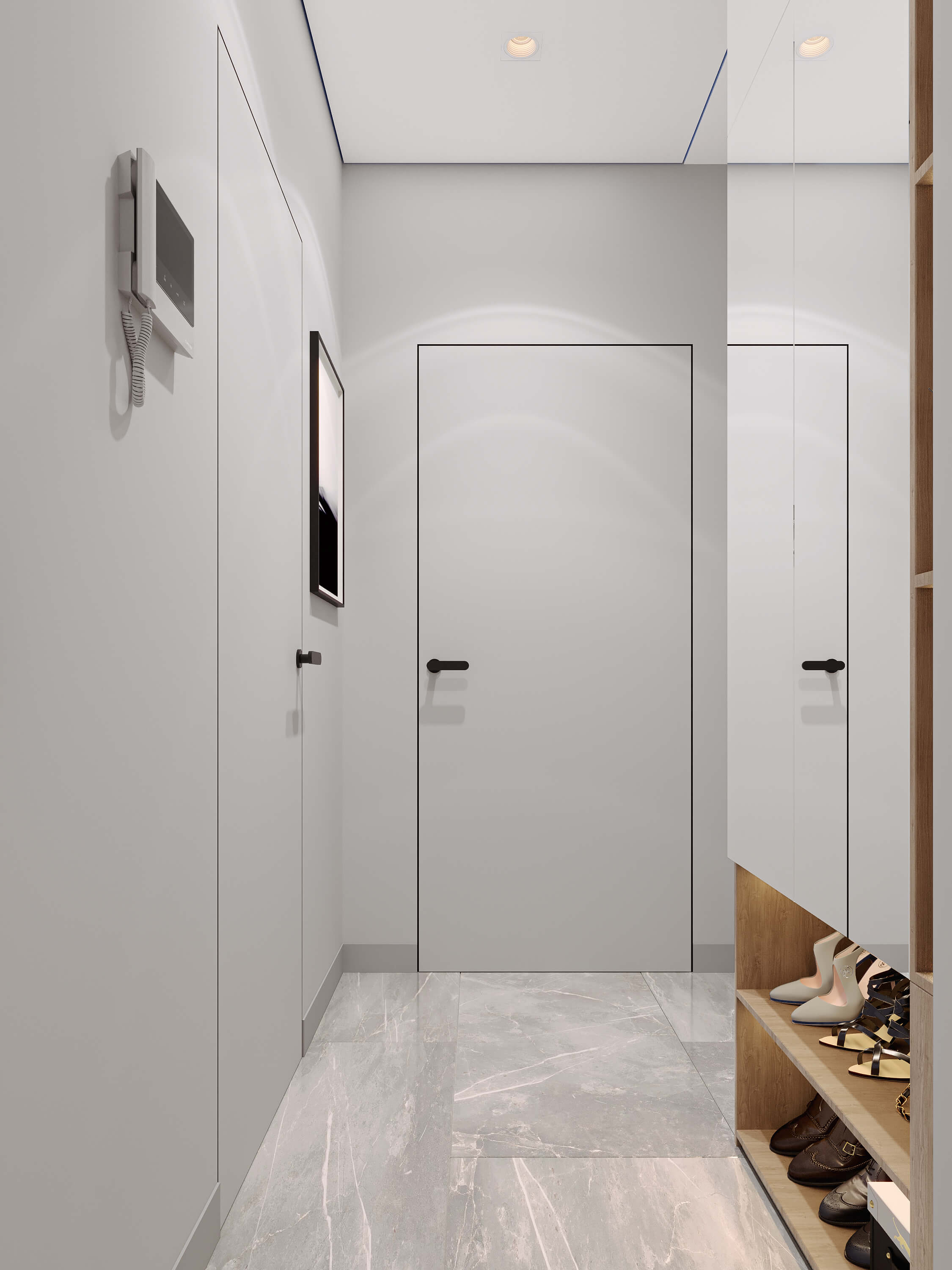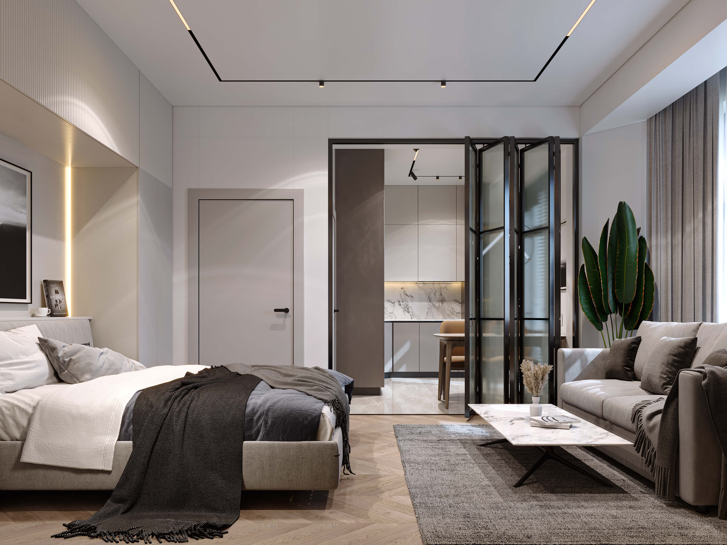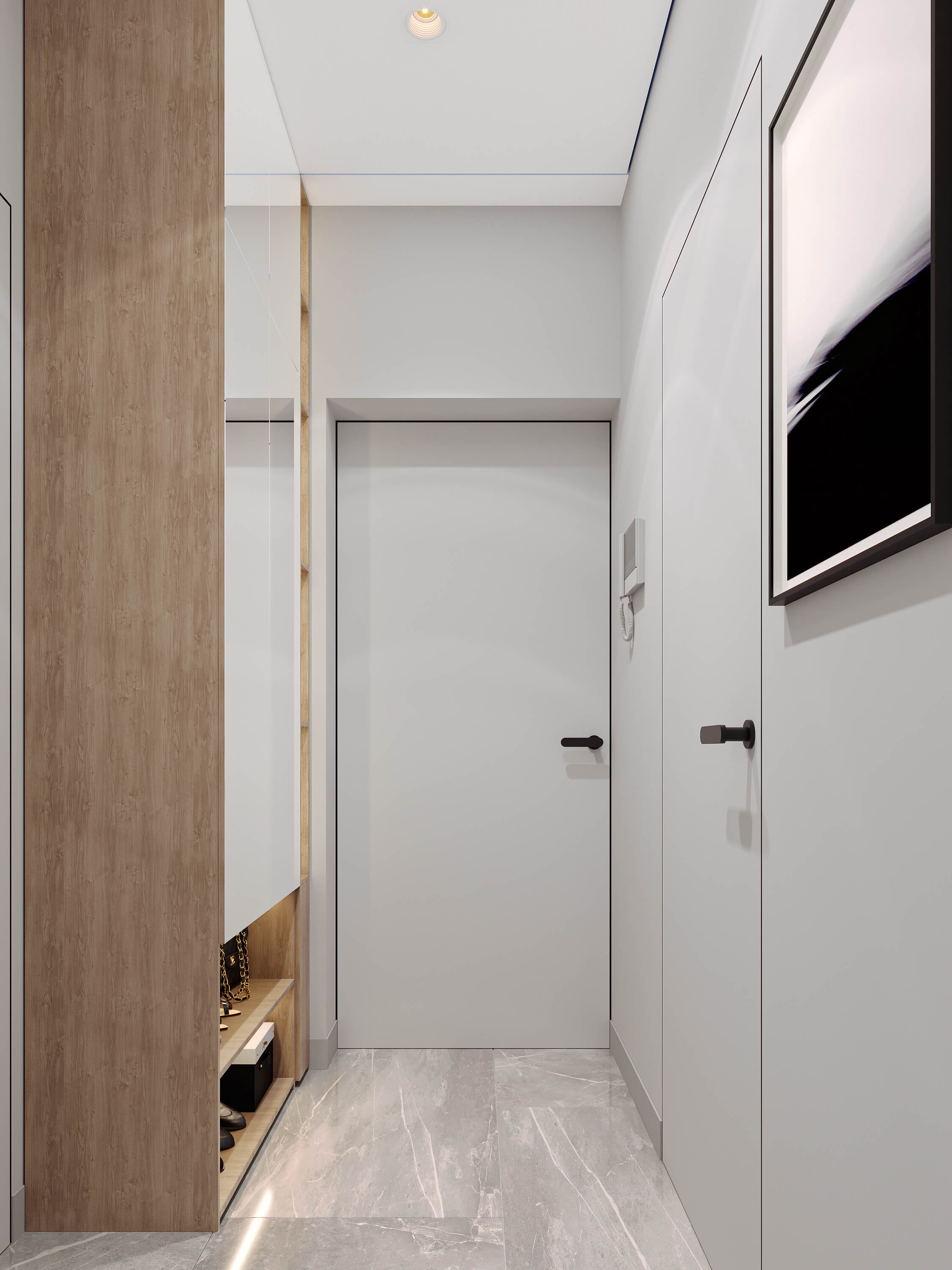 This project made in a minimalist style for a small space has all the comforts.Our 1-room house consists of a hall, a bathroom, a bedroom/living room, and a kitchen.