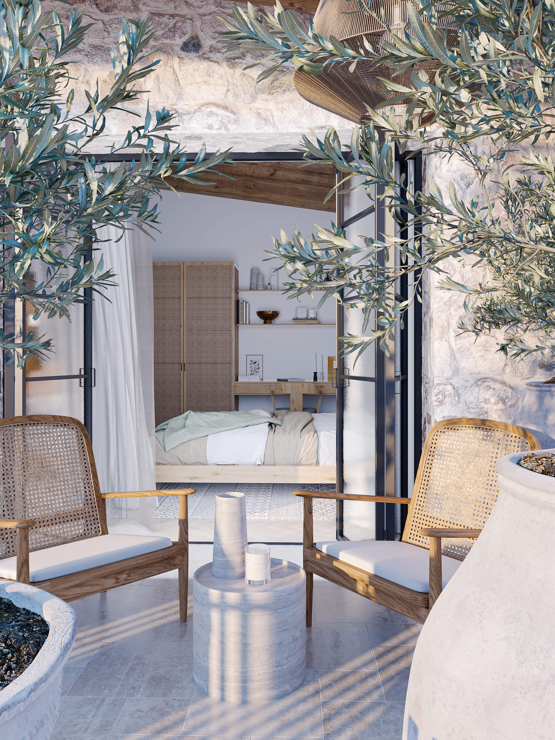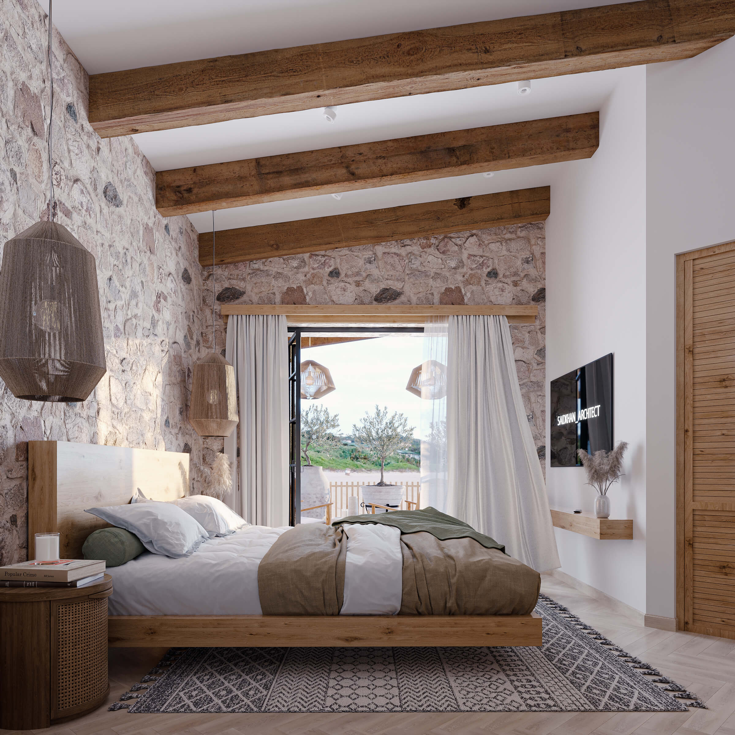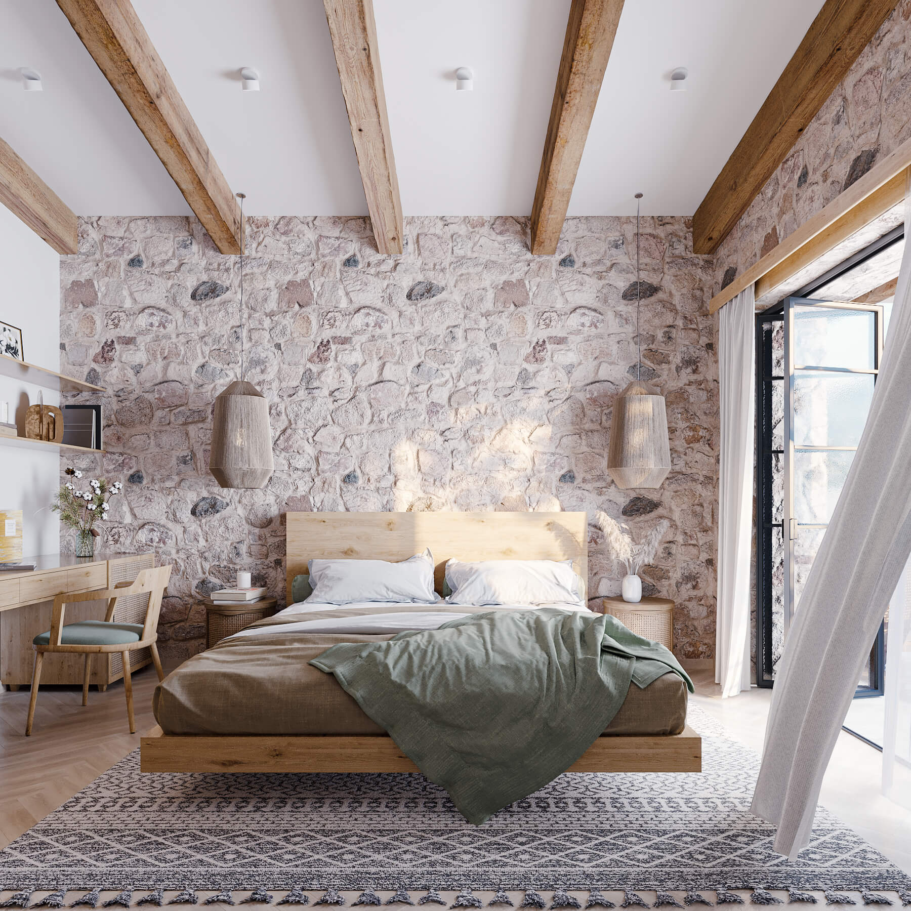 Stone, wood and natural fabrics are used in large open spaces, harmoniously connected with nature. Nowadays, we have a lot of unnatural materials. They are not environmentally friendly because they contain chemicals. This slowly harms human health. Since ancient times, people used only natural materials to build houses. Even now, people in developed countries understand its importance and use this style widely.